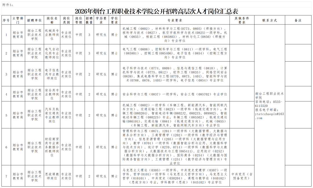 烟台工程职业技术学院公开招聘高层次人才的岗位条件、招聘人数等具体要求见《2026年烟台工程职业技术学院公开招聘高层次人才岗位汇总表》(附件1,以下简称“《岗位汇总表》”)。