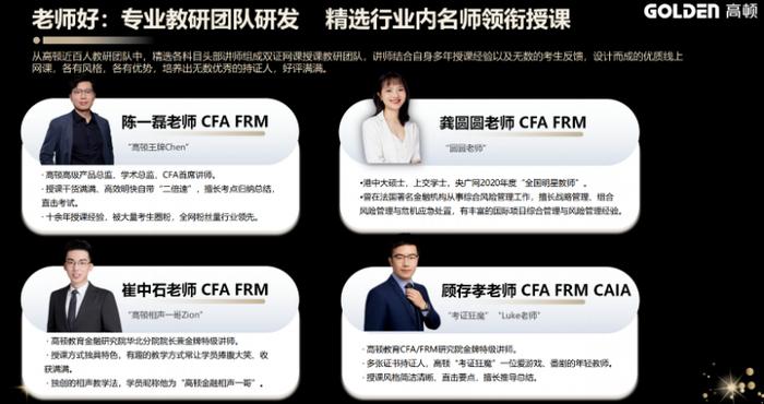 专业是教育的立身之本,高顿教育始终将教研与师资建设作为核心竞争力,以极致专业筑牢 CFA 培训的根基。在师资层面,高顿打造了一支 “双证加持、实战兼备” 的顶尖教学团队,授课教师均同时持有 CFA 与 FRM 双证书,83% 拥有海外留学深造背景,75% 具备硕士及以上学历,平均教学经验超五年,更有陈一磊、崔中石、文骏程等行业王牌讲师坐镇,他们兼具深厚的学术功底与金融机构核心岗位实务经验,既能精准拆解考纲考点,又能结合资本市场实操案例让理论知识落地。同时,高顿组建了近百人的专业教研团队,持续跟踪 CFA 协会考纲动态,深度研究考试命题规律,自主研发适配华人考生的学习资料,从知识框架图、核心公式手册到高频考点总结,全方位为学员备考保驾护航。