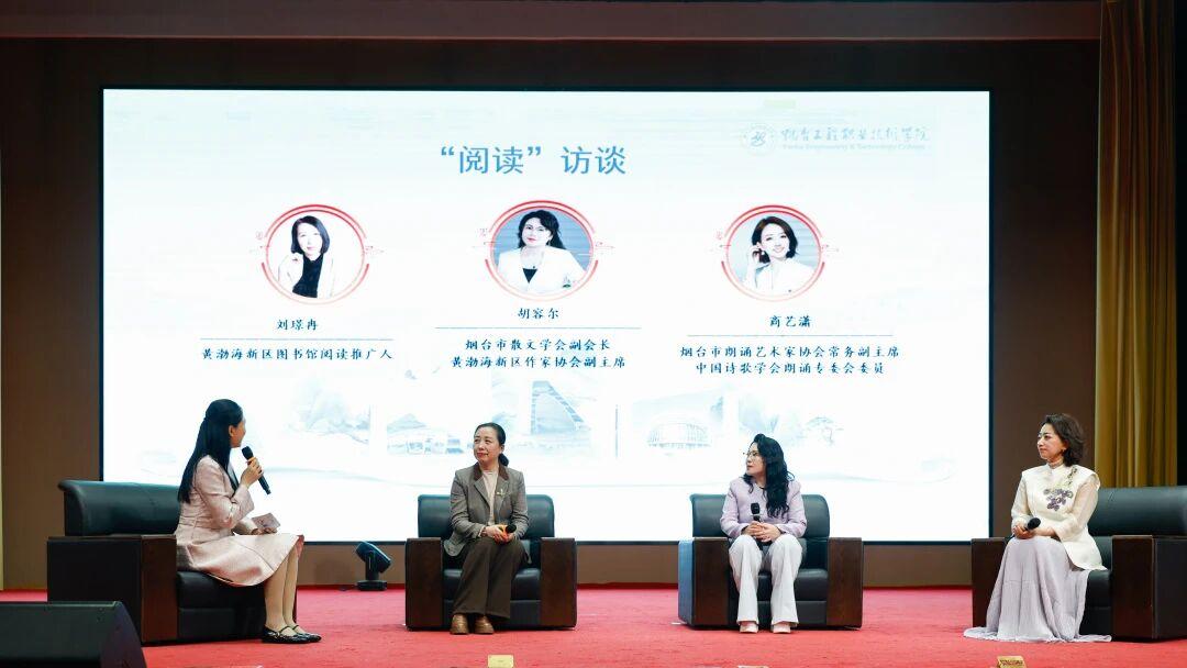 “新六艺・阅美同行”美育大讲堂的访谈环节,烟台市朗诵艺术家协会副主席商艺潇,烟台市散文学会副会长、黄渤海新区作协副主席胡容尔,黄渤海新区图书馆阅读推广人刘璟冉围绕阅读、推广与创作展开对谈,分享各自的阅读故事与推广心得,为学生打开阅读、朗读与写作新思路。在“悦读鉴赏”环节,朗诵艺术家们带来了精彩的经典作品演绎《纸船——寄母亲》《出师表》等,并邀请大学生上台互动,现场指导朗诵技巧。一位参与互动的学生表示:“原来阅读可以这样有力量!老师教我们如何用气息传递情感,感觉书本里的文字一下子活了起来”。活动在烟台市首届全民阅读周原创诗合诵《翻开书,世界向你走来》中推向高潮,学院教师与市朗协艺术家联袂演出,以声韵之美传递经典力量,展现了校地文化深度融合的生动图景。现场不少师生表示,这样的活动让他们重新感受到了阅读的魅力。